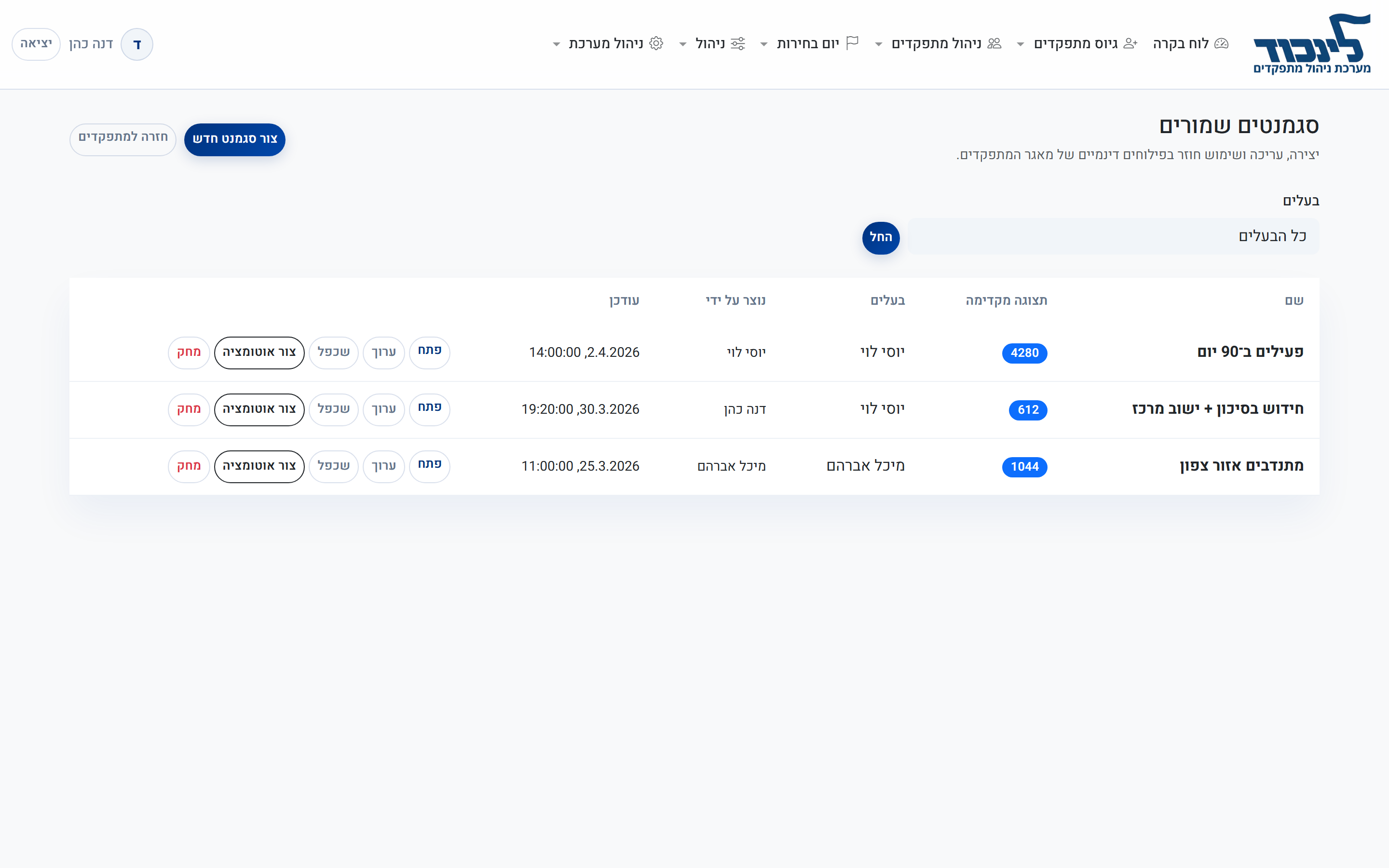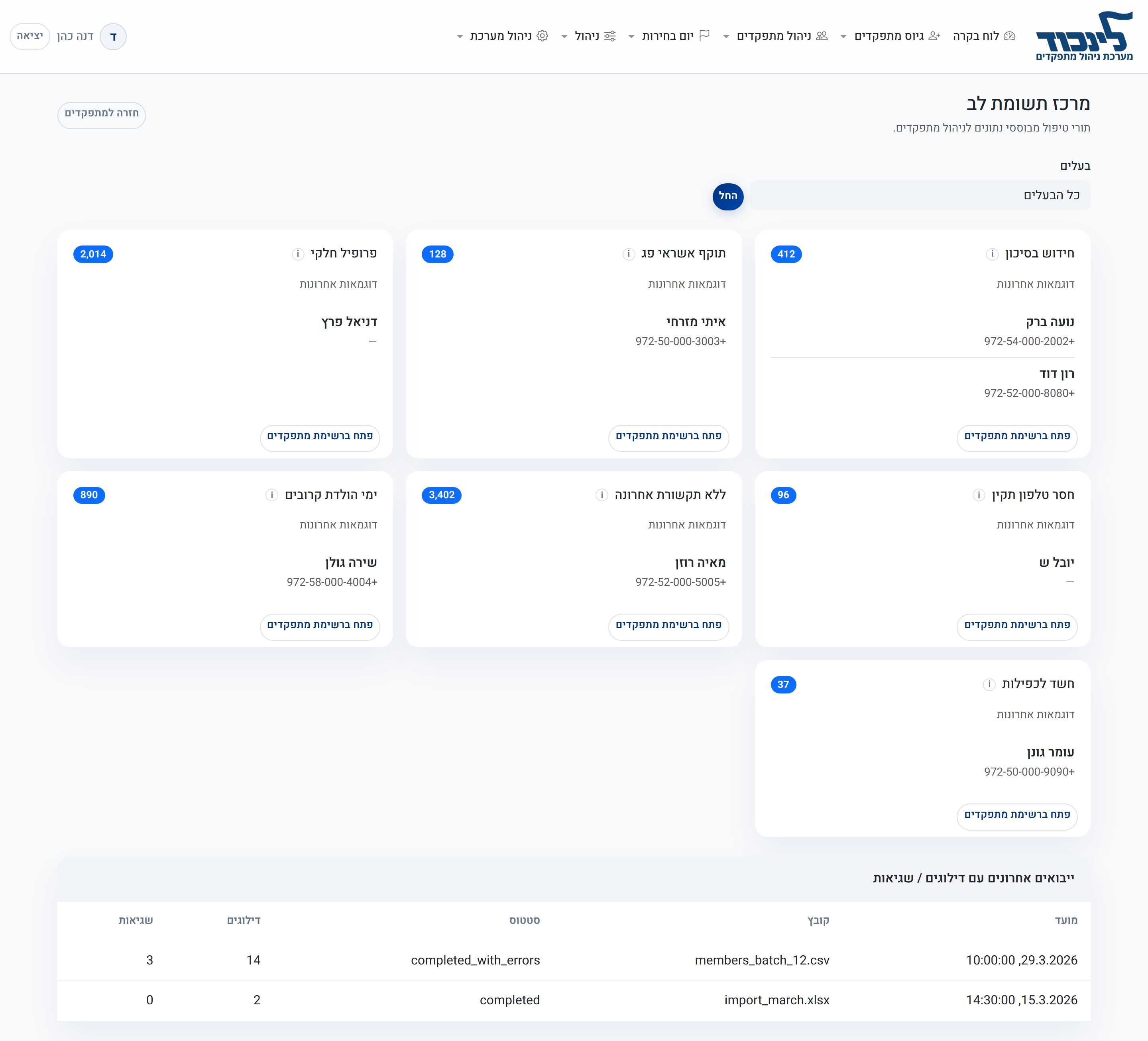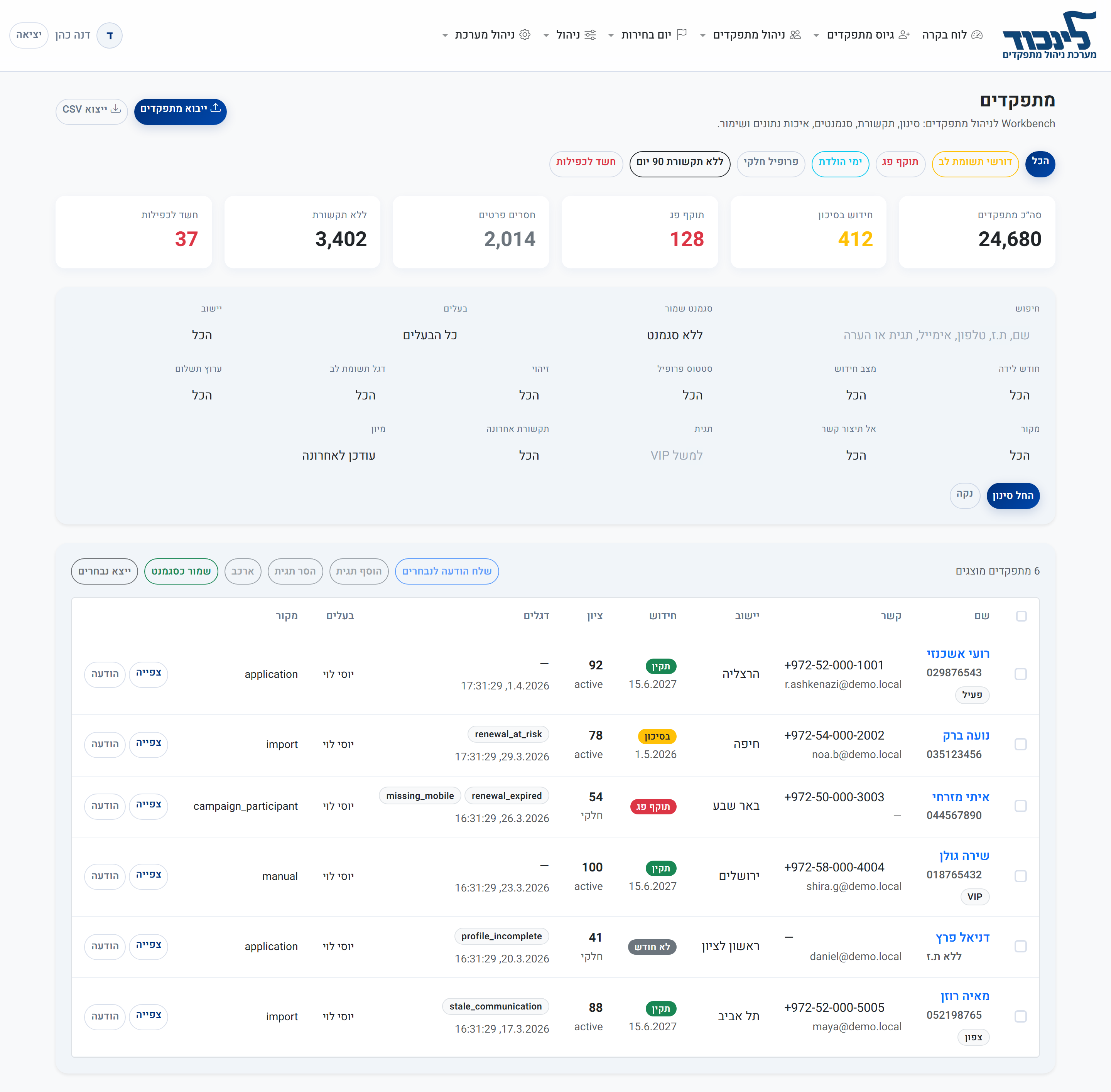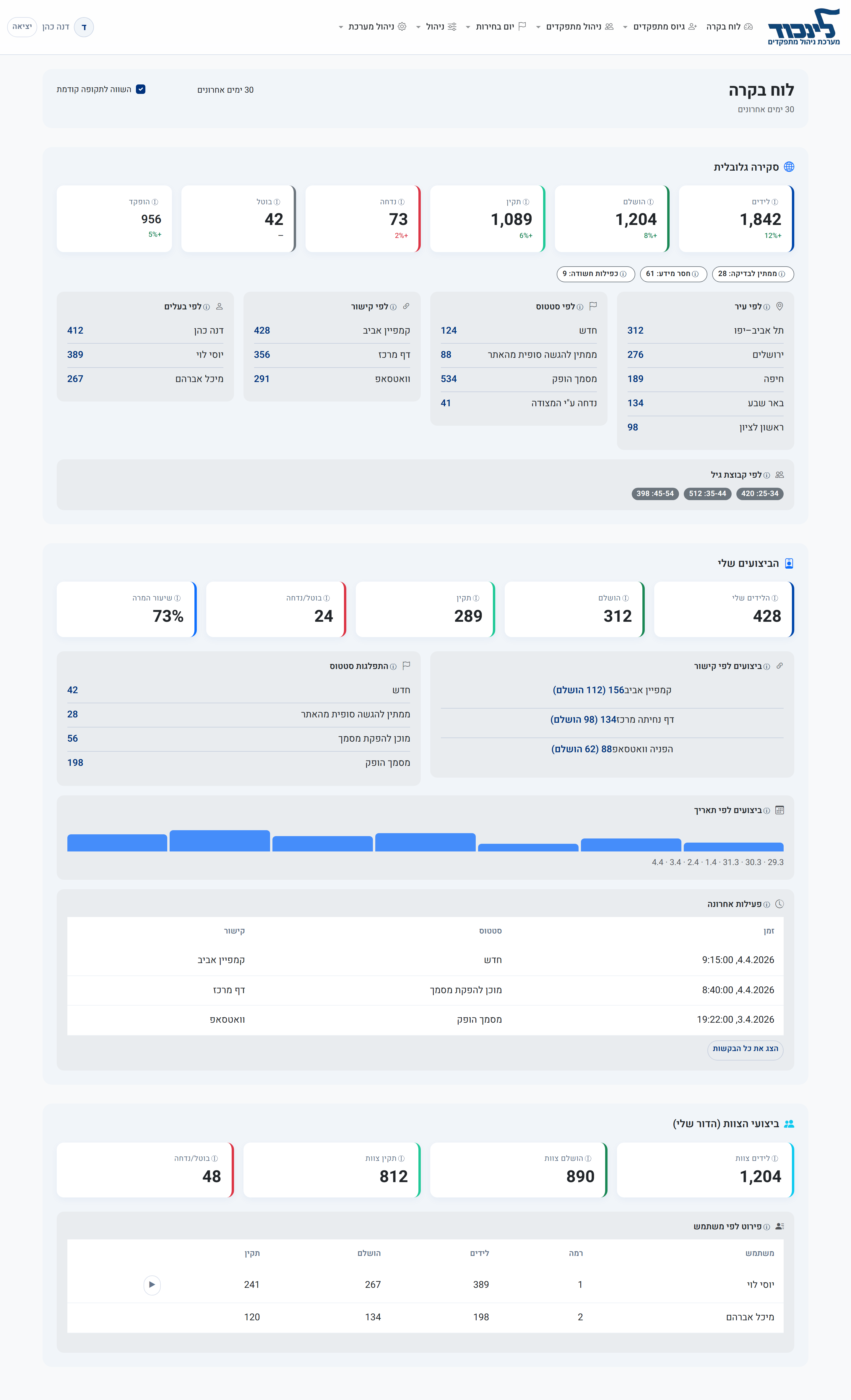 - פילוח לפי יישוב, סטטוס, מקור, תגיות ופרמטרים נוספים