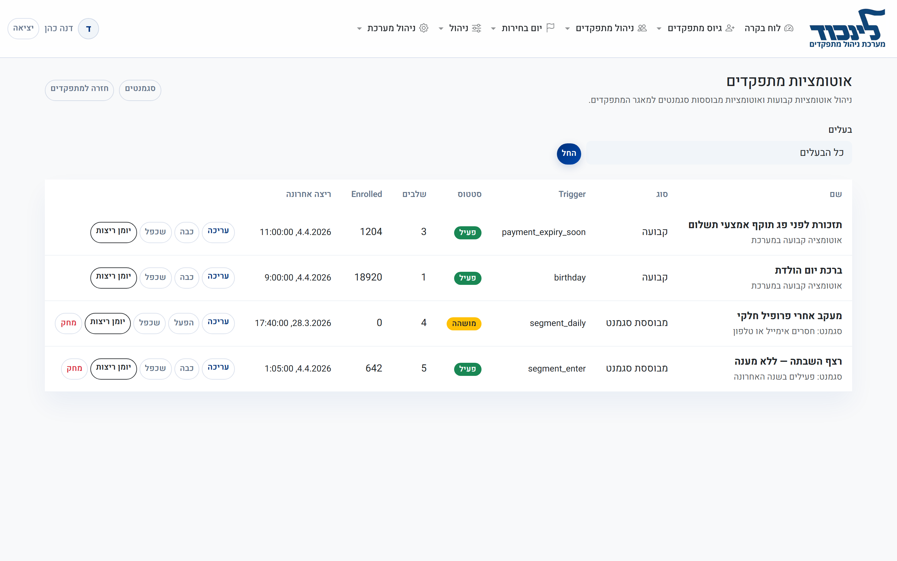 - אוטומציות מבוססות סגמנטים — הודעות ממוקדות לפי קהלים שהגדרתם